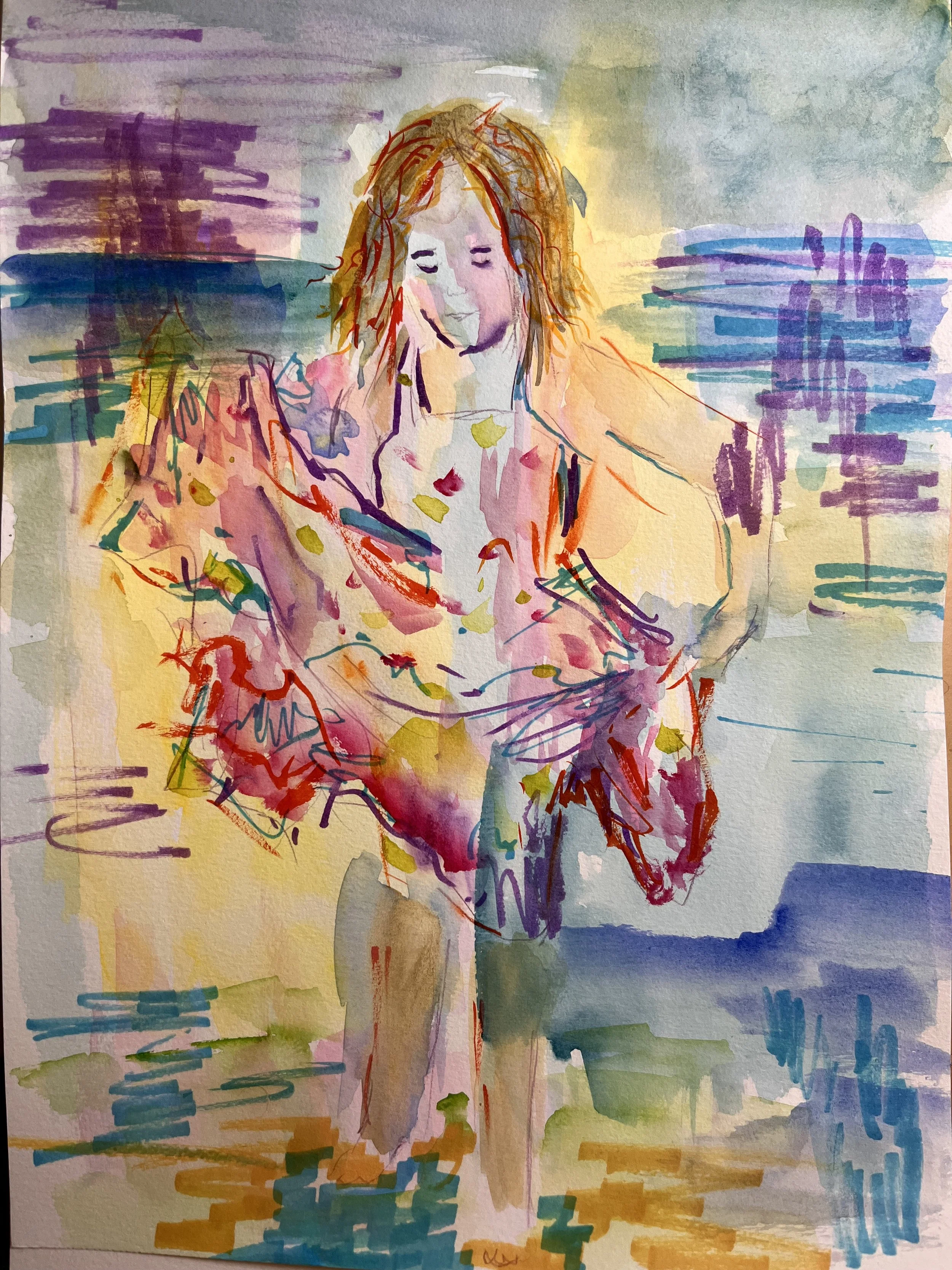 But I CAN answer how I personally try to face down impossible questions like that, decide to ignore them, and get on with my life - by paying attention to beautiful little moments like my kid wading into a hot lake, having her picture snapped by our talented friend - and then trying to paint that image in the most carefree way I can come up with. This is one of my latest art course assignments - a daily exercise in just fucking around with different media and approaches than what I typically do. I showed it to my Dad, and he thought it had been done by my 5 year old - a success! - when I said it was mine, he responded “it’s more free-balling than your usual stuff.” I can always count on my Dad for the best critiques.